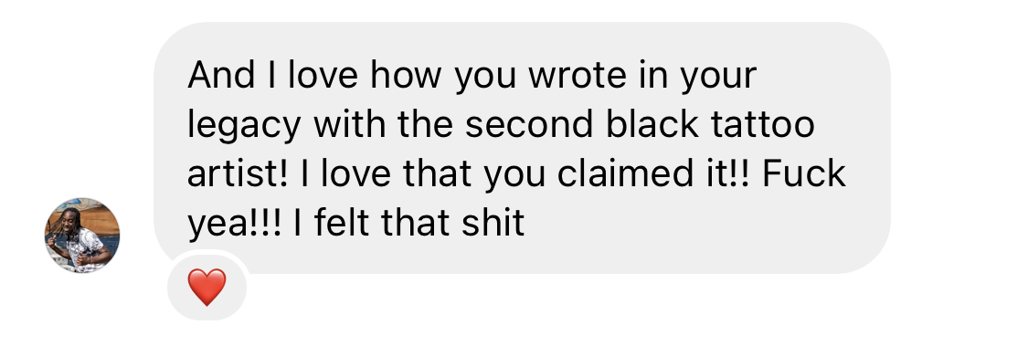 "I watched her push forward and lay the way for many black women in the tattoo industry today. Overcoming dark periods in life, shining through with a light that has inspired many including myself."